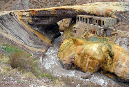 El Puente del Inca es una formación rocosa que forma un puente natural sobre el río Las Cuevas. Está ubicado al noroeste de la provincia de Mendoza, Argentina, y su curiosa formación y pasado como hotel de baños termales lo han convertido en un punto turístico destacado, actualmente considerado un Área Natural protegida por la provincia.